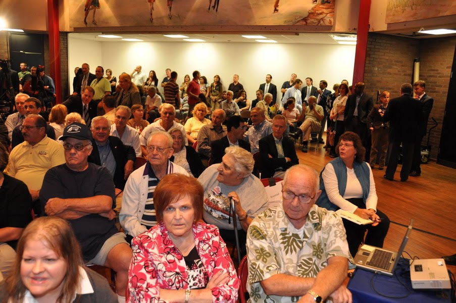 The Dem candidate for Sheriff, a short lawyer named Brophy, spoke briefly. He focused on spending by the current Sheriff's Department. According to him, the department is "losing about $2,500 per day. Over the year, this adds up to $8-9 million". Hmmmm. Maybe, but he's wrong by a 0 (a factor of 10). Won't blame him personally for this, after all if you're an Obama supporter you start mistaking trillions for billions and billions for millions.